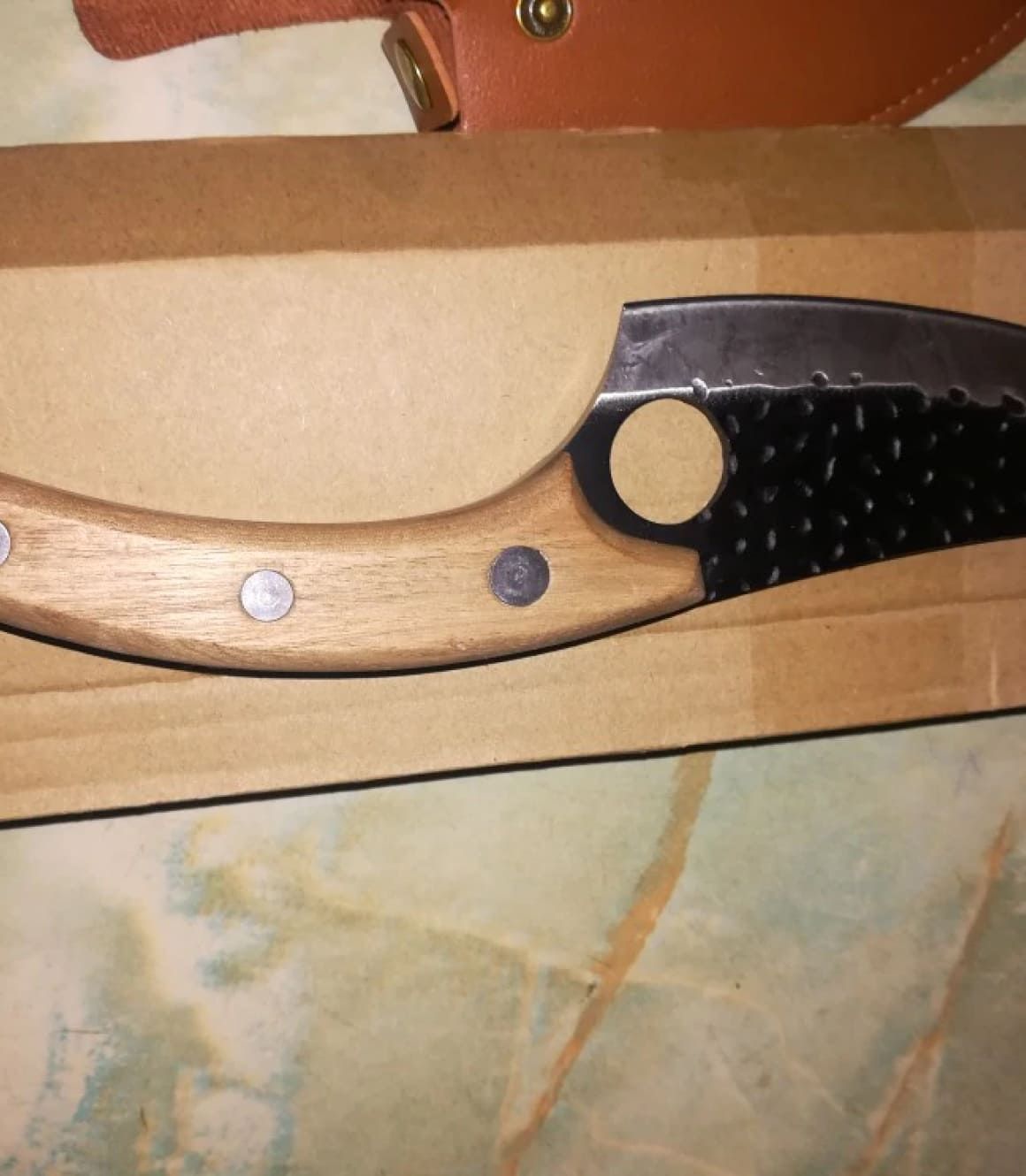 Knife is as advertised. Sharp and ready to use. The hole in the bottom of the blade results in excellent balance when using and I am convinced it will retain its sharpness for a long while. I will be ordering a sharpening stone so that if I ever need it I will have it.