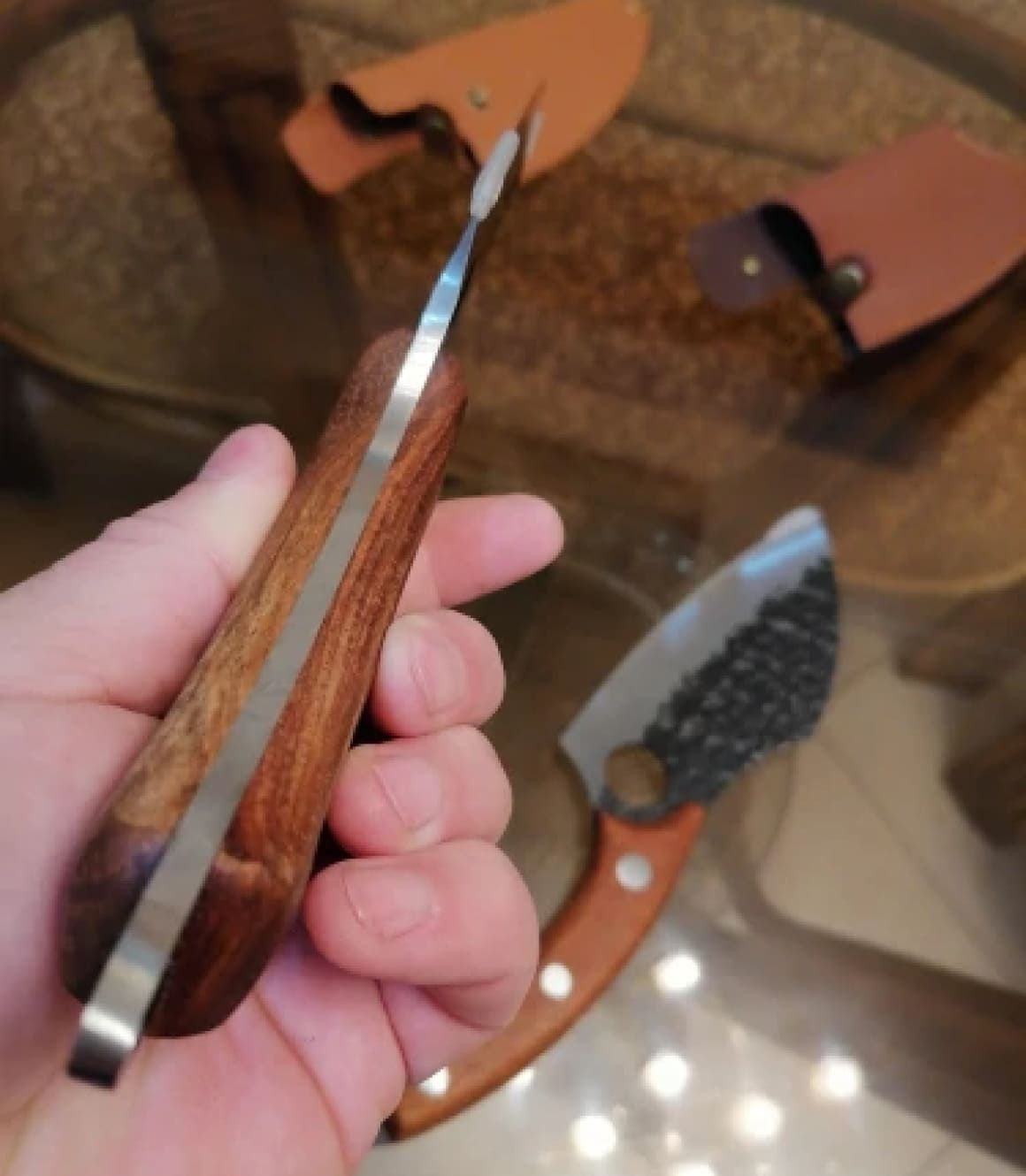 The knives and leather cases arrived very quickly. I bought them as gifts for family members. I love the quality of all of the knives; and I was skeptical about buying the leather cases. I am so glad I bought them. They are a very high quality; and make a nice addition to the knives as gifts. All in all I am very pleased with my purchases.